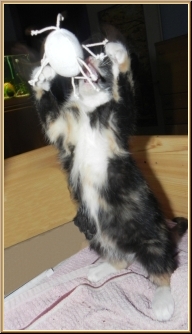 Hallo Ramona, ganz liebe Grüße von Deiner Minimieze! Du, mir geht es total gut und ich bin schon richtig groß geworden. In zwei Hände passe ich jetzt nicht mehr. Ich übe auch ganz dolle mit Spielsachen und lege später bestimmt mal viele Mäuse vor unsere Haustüre. Aber erst mal mache ich hier drinnen viel Unsinn. Ja, die großen Katzen ärgern macht Spaß und wenn sie mich anbrummeln, lege ich die Ohren an und ärger sie halt später nochmal. Ich lasse mich doch nicht unterkriegen. Hee, ich doch nicht! |